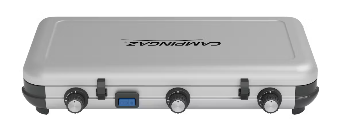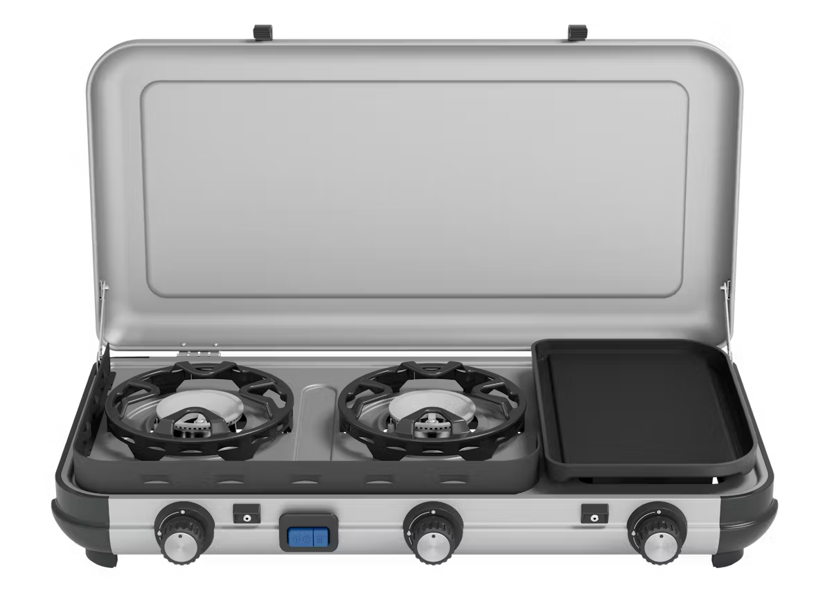 This versatile double burner stove with an additional griddle provides a wide range of cooking options—perfect for family camping trips or longer outdoor adventures. Although wider than a standard stove, it remains lightweight and easy to transport. It features two powerful 1800-watt burners and a dedicated 900-watt tube burner for the griddle, allowing you to cook multiple dishes at once.