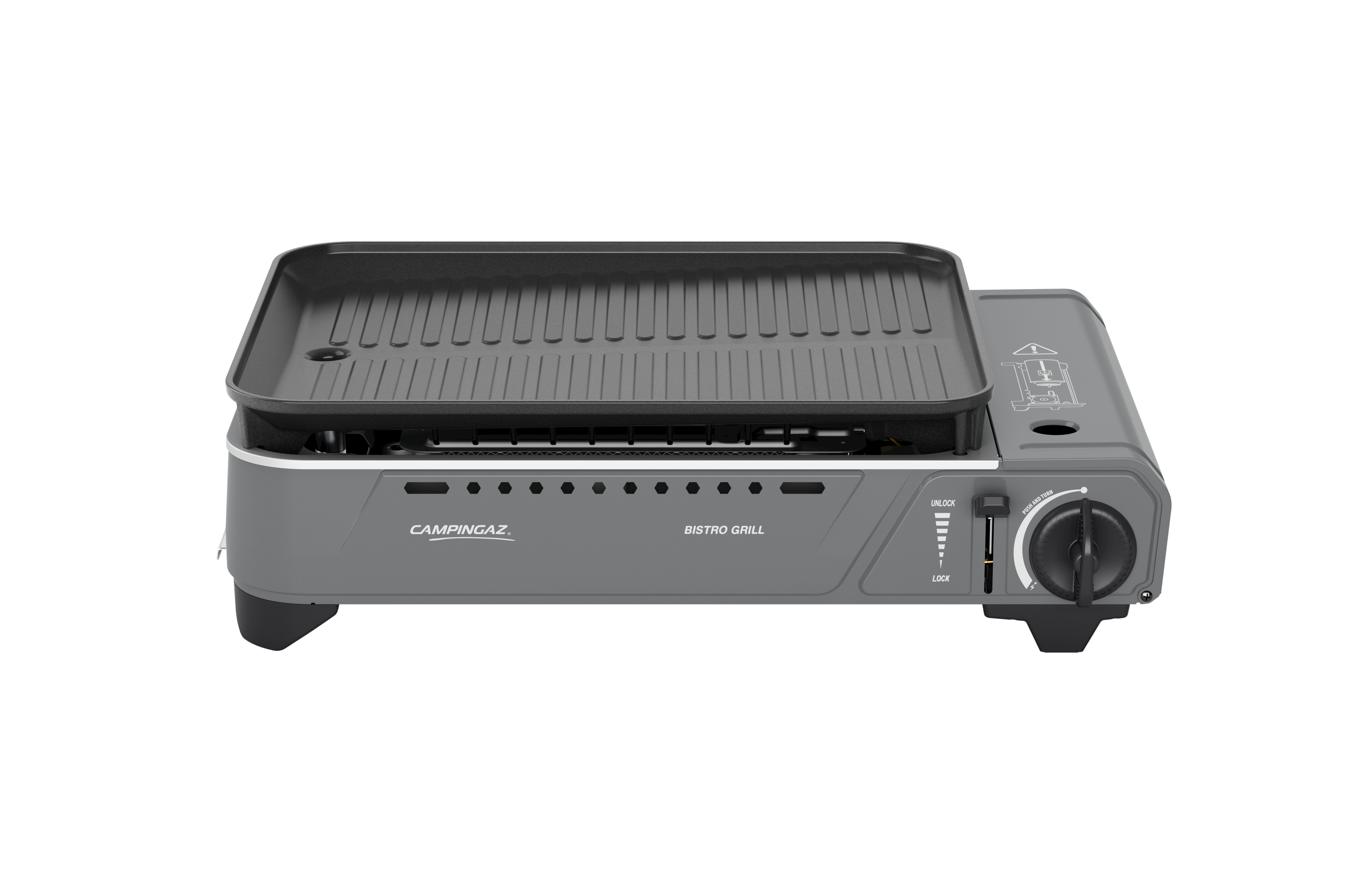 Built with safety in mind, the Bistro Grill includes a gas cartridge locking system that ensures the cartridge is securely engaged before ignition, preventing leaks. It also incorporates two internal gas safety mechanisms: one automatically ejects the cartridge when not in use, and the other cuts off the gas supply if the cartridge compartment overheats. Four sturdy feet provide stability and elevate the unit to allow proper airflow underneath, reducing the risk of overheating.
