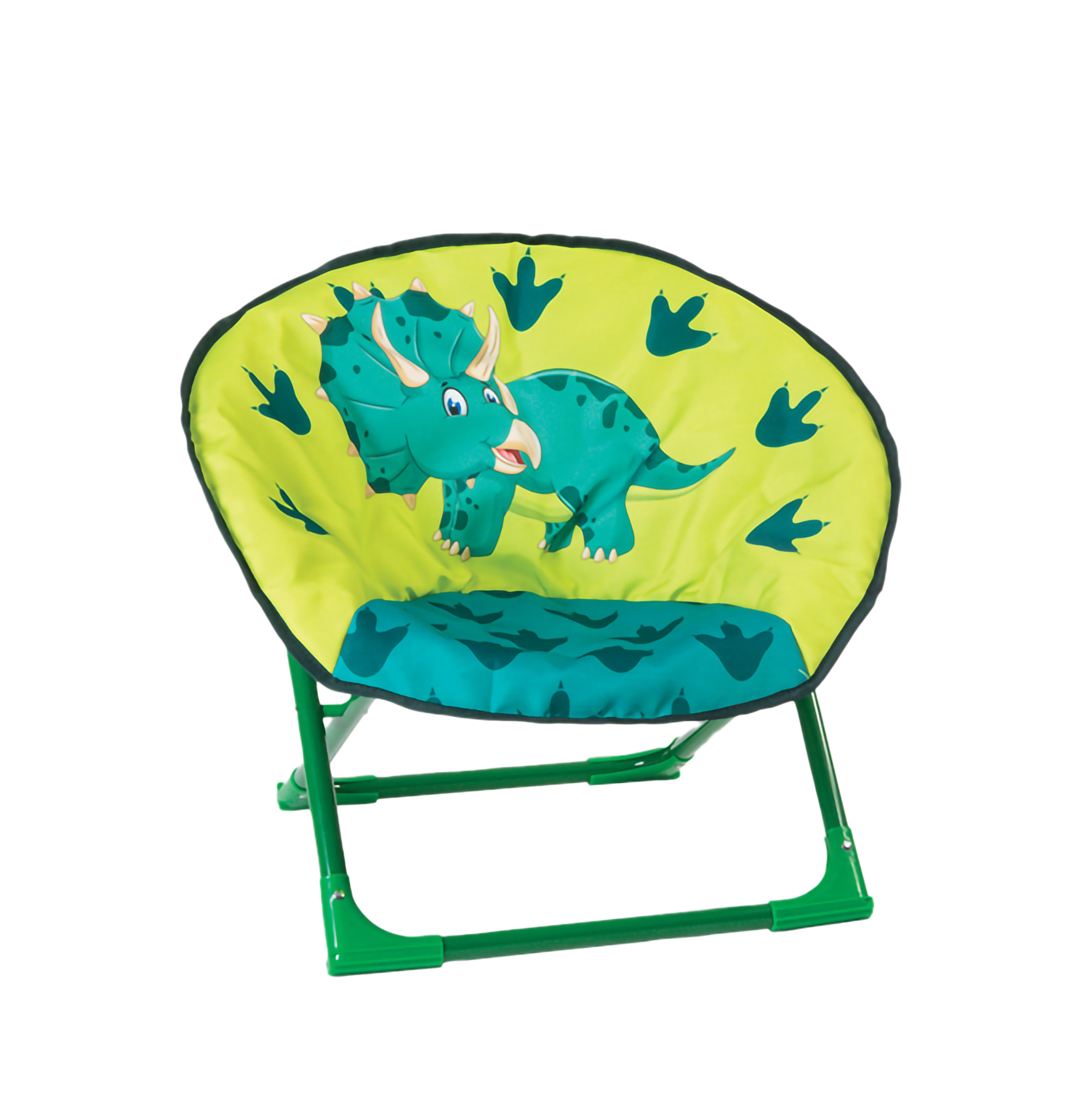 A fun, child-sized moon chair featuring a playful green dinosaur design and a matching powder-coated steel frame. The frame folds in and out in seconds and includes a built-in safety lock to keep it securely in place. Perfect for young campers, this chair combines comfort, convenience, and plenty of character.