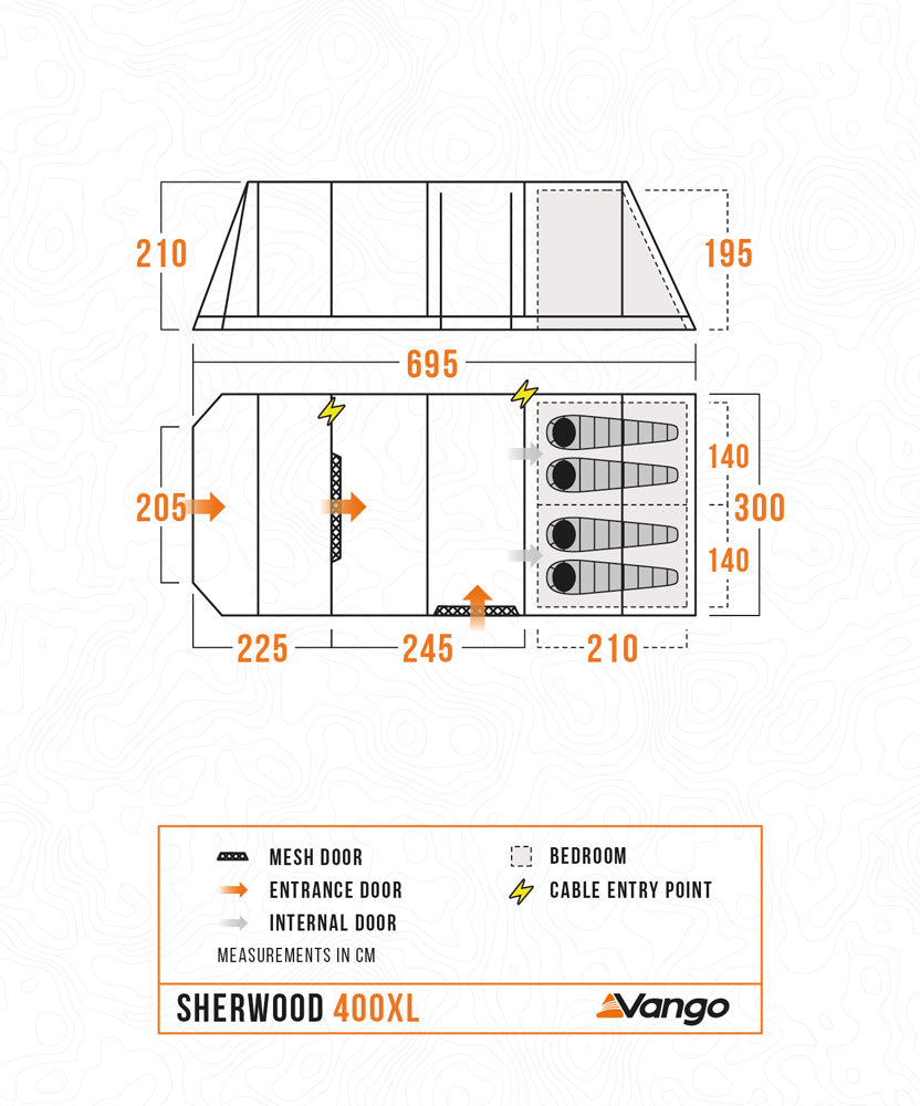 Inside, King Size Midnight Bedrooms use premium darkened fabric to reduce early morning light, ensuring a more restful and comfortable night's sleep. For added convenience and protection, the Sherwood 400XL also includes a groundsheet protector, which helps extend the life of both the groundsheet and the tent itself.
