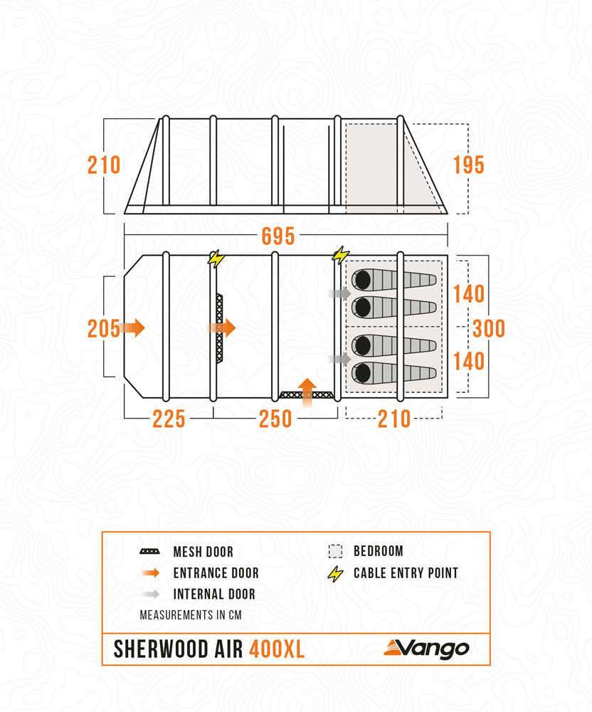 The Sherwood Air 400XL is a spacious 4-person AirBeam® tent featuring an integrated front awning, providing additional living space ideal for relaxing or storing gear. Thanks to Vango’s innovative AirBeam® technology and included pump, this tent is quick and easy to pitch—ready in just minutes.