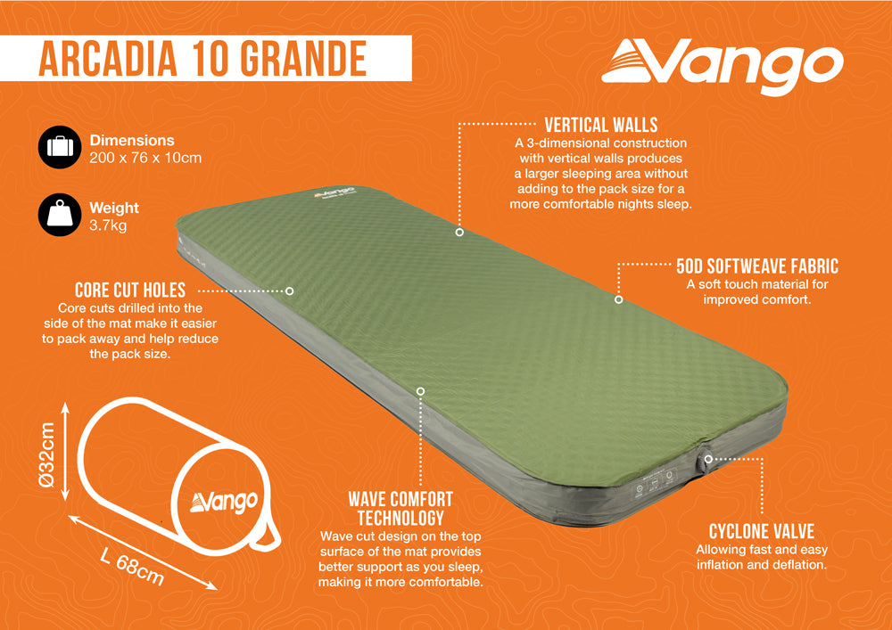 The Vango Arcadia 10cm Single self-inflating sleeping mat offers unrivalled comfort and convenience. Designed with a stylish, soft-touch flocked finish top and durable non-slip base and Cyclone Flip Valve, inflation and deflation are very quick.