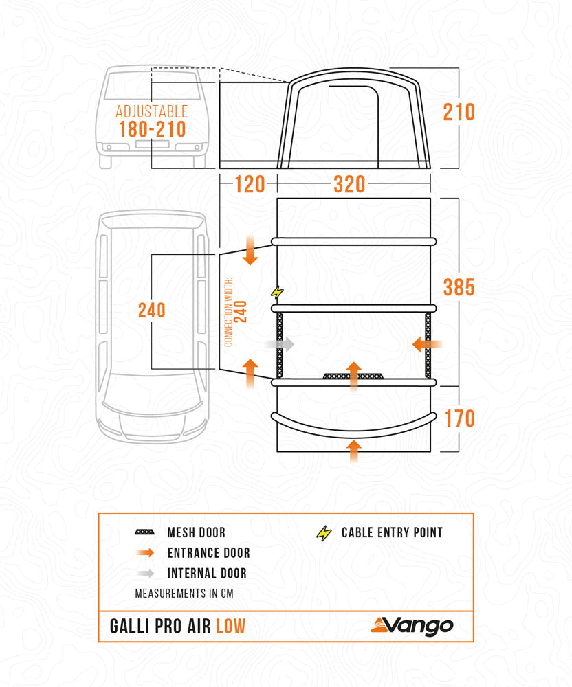 The Vango Galli Pro Air drive-away awning is perfect for campers seeking a spacious and versatile extension to their vehicle. Thanks to Vango’s inflatable AirBeam® technology, it pitches in minutes—giving you more time to relax and enjoy your trip. Crafted from Sentinel ECO Pro fabric made with recycled materials, it’s both durable and eco-conscious, ideal for touring adventures. Multiple attachment options make setup easy, while the roll-away tunnel allows you to leave the awning free-standing when you're off exploring. For added flexibility, upgrade with a single (BR001) or double (BR005) bedroom to create extra sleeping space for guests.