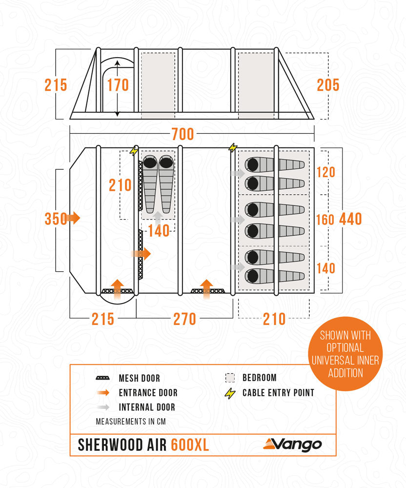 Part of the Vango Excel Collection, the Sherwood Air 600XL is made from robust 150D embossed fabric with an impressive 5,000mm hydrostatic head for superior waterproof performance. It also features ColourLok technology to enhance colour retention and resist UV fading over time. Inside, King Size Midnight Bedrooms use premium darkened fabric to reduce early morning light, ensuring a more restful night’s sleep. For added flexibility, the tent is compatible with the optional Universal Inner, perfect for extra sleeping space or additional storage within the living area.